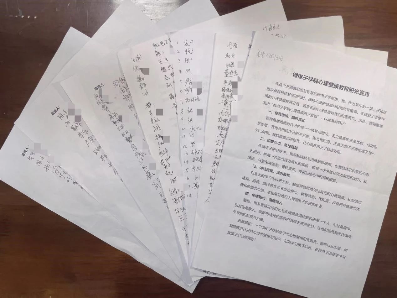 主题班会最后,为鼓励同学们接纳自我、积极向上、充分放松、传递温暖,各班组织签订了《EMC易倍心理健康教育阳光宣言》,同学们认真阅读了宣言书的内容并签名。